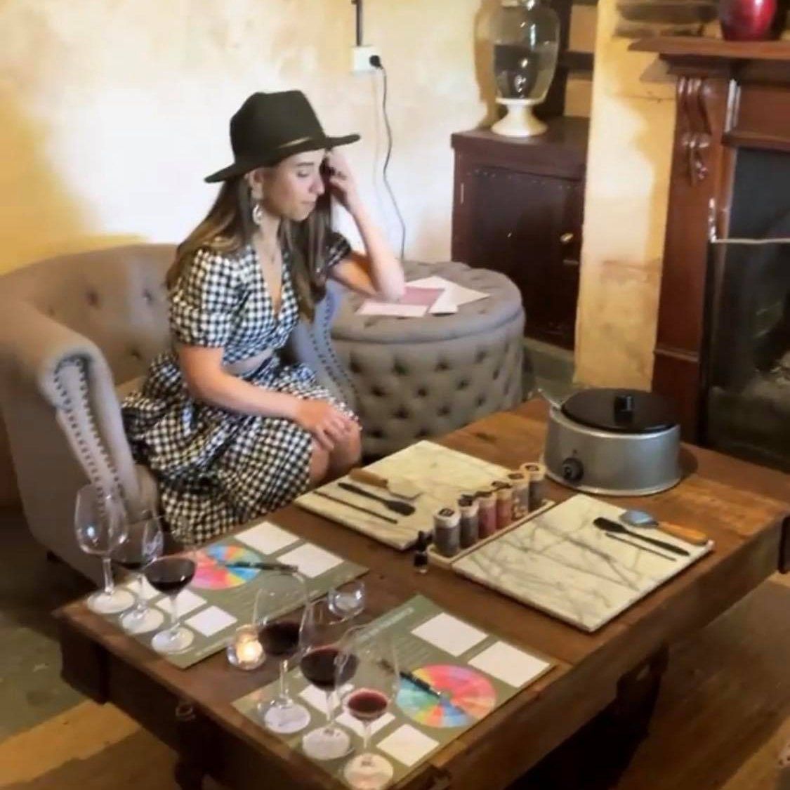 Being the only winery in SA who makes chocolate onsite has it's advantages! We set you up with a pot of our melted chocolate, along with jars of seven flavours - including freeze-dried fruits, coffee, vanilla bean and paprika. You will make up to four different chocolates to test with three of our wines, before choosing your final flavours and making your own block of chocolate.