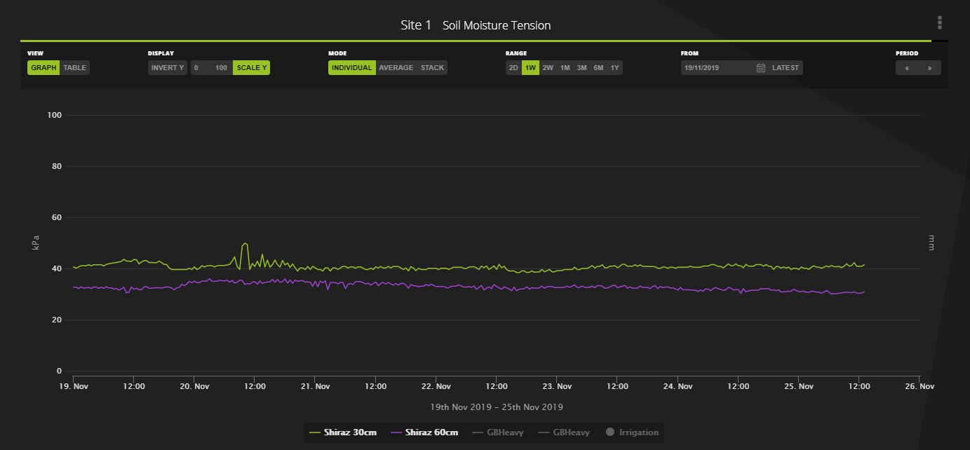 Later again, after the berries change colour (known as veraison, which happens late Jan), studies have found no benefit from deficit irrigation, and there is a significant risk of yield loss in hot weather, so we prefer to reduce the stress on the vines during this phase, with minimal watering, only where required to sneak the soil moisture into a lower stress range. With our shiny new graphs, we can be much more precise in our irrigation scheduling - and save water, while maximising quality.